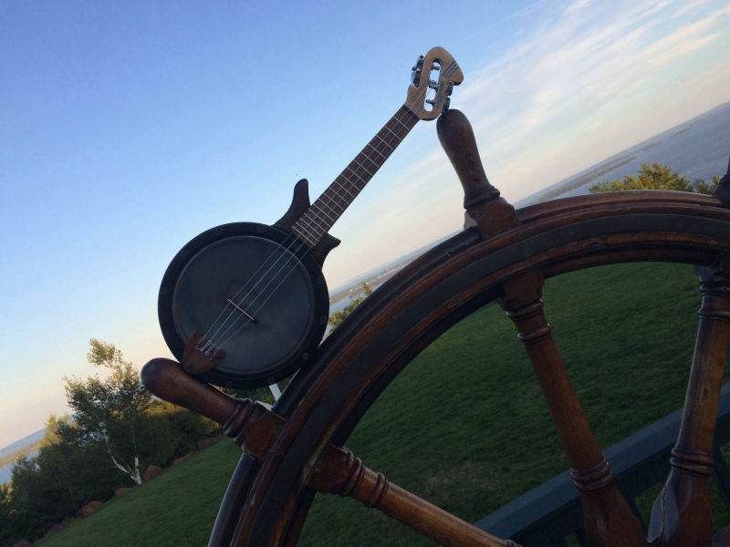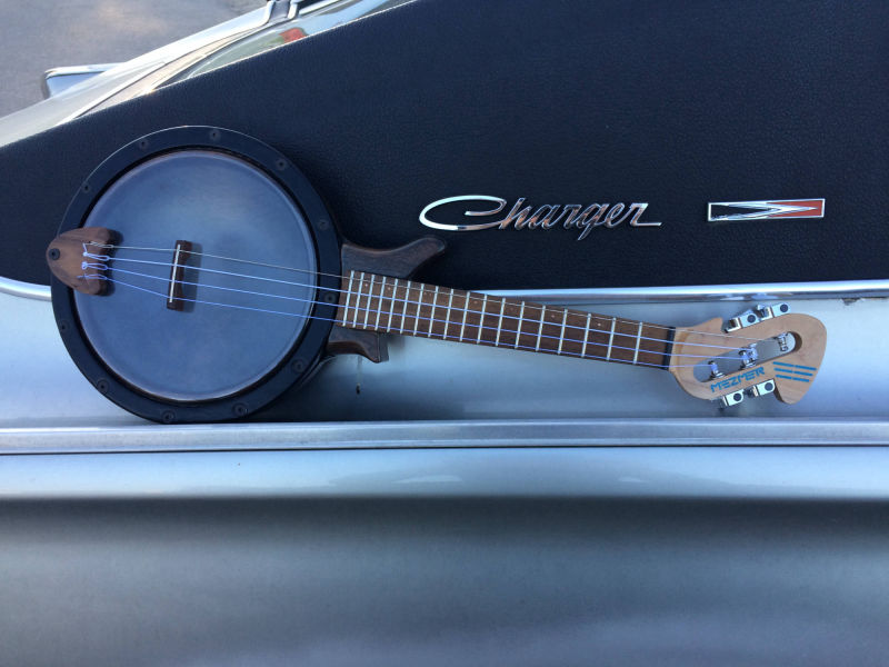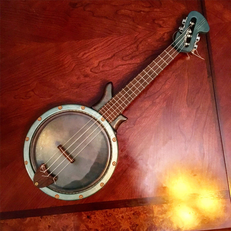 Built with a variety of hardwoods and reclaimed materials. Mezmer Banjoleles incorporate a sphere shaped back body which reflects the sound of the strings in a uniform and gradual way so that all frequencies are evenly represented in body resonance and and overemphasized notes or "wolf tones" are eliminated. The spherical design also mellows the sometimes strident attack of traditional Banjo design placing its tones closer to a Ukulele when strung with nylon strings. Steel strings can be used to move the tonal spectrum closer to that of a regular Banjo while still keeping the instrument from having too much of a face punching bark ;) .