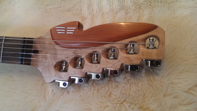 The Hyperion reverse headstock maximizes proper benefits of string length vs. tension. That is, longer length on bass string yields a tighter feel and stronger fundamental whereas the shorter length on the treble strings facilitates ease of bending and allows the player to use a heavier gauge string for stronger tones. The Mezmer reverse slotted headstock design is an innovative solution to the usual flipped headstock problem of uncomfortable access to tuners, with the Mezmer 6 on a side slotted style, a player can reach over quickly to make tuning adjustments during a performance with ease.