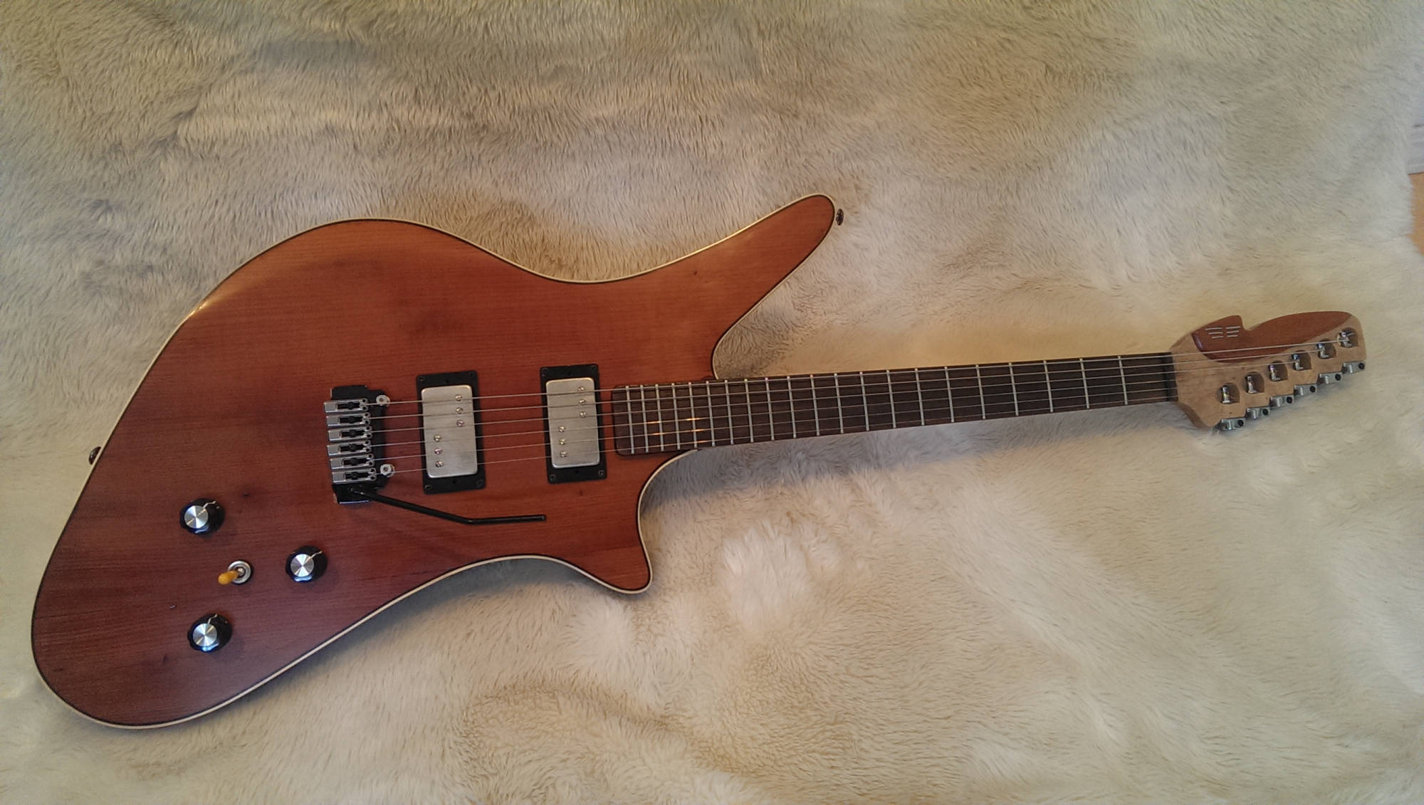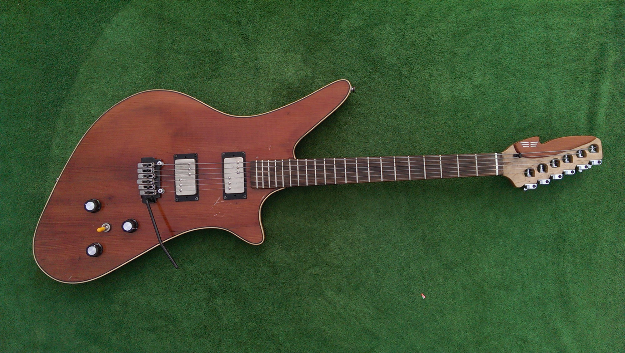 The unique and innovative contours of the Hyperion body were conceived with many features in mind. The upper horn provides perfect balance point for a strap in standing position as well as a comfortable support to lean into when in seated positions. The lower bout extends the control cavity for progressive electronic expansion as well as providing wood mass behind the bridge which helps to give the guitar a strong midrange voice and a particularly warm growl when pushing amplifier gain.