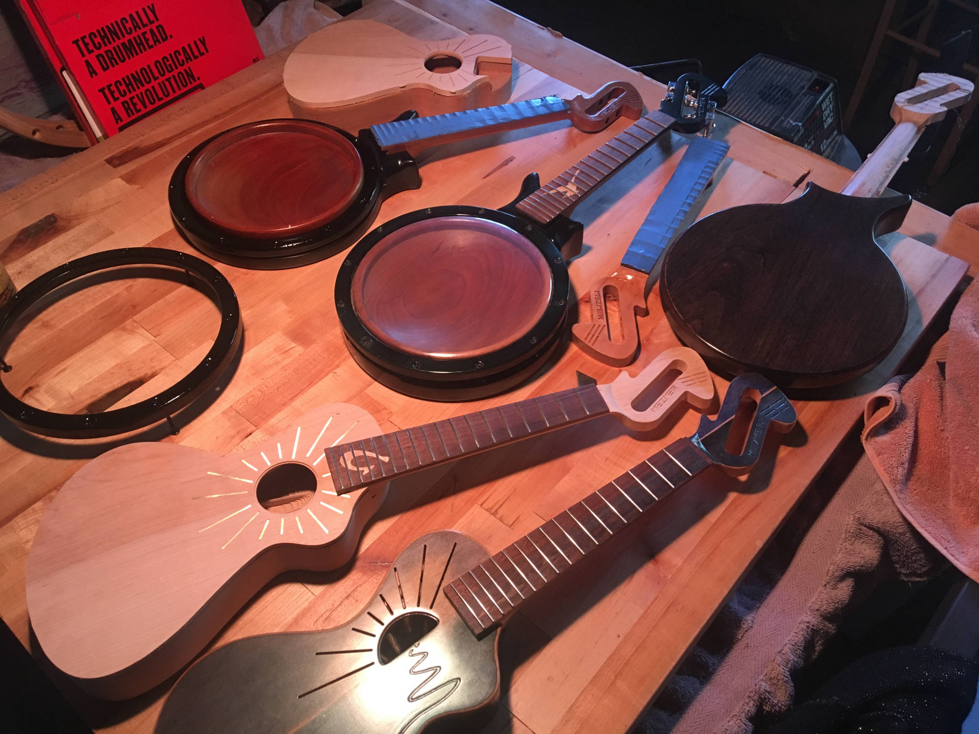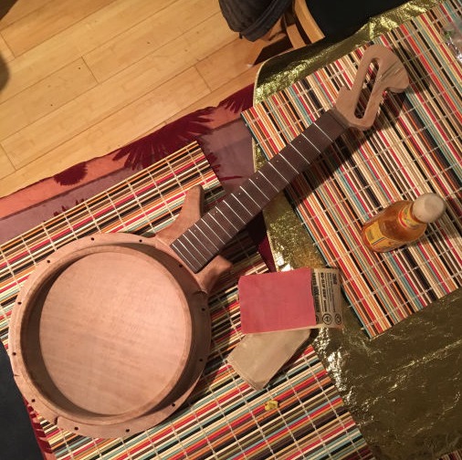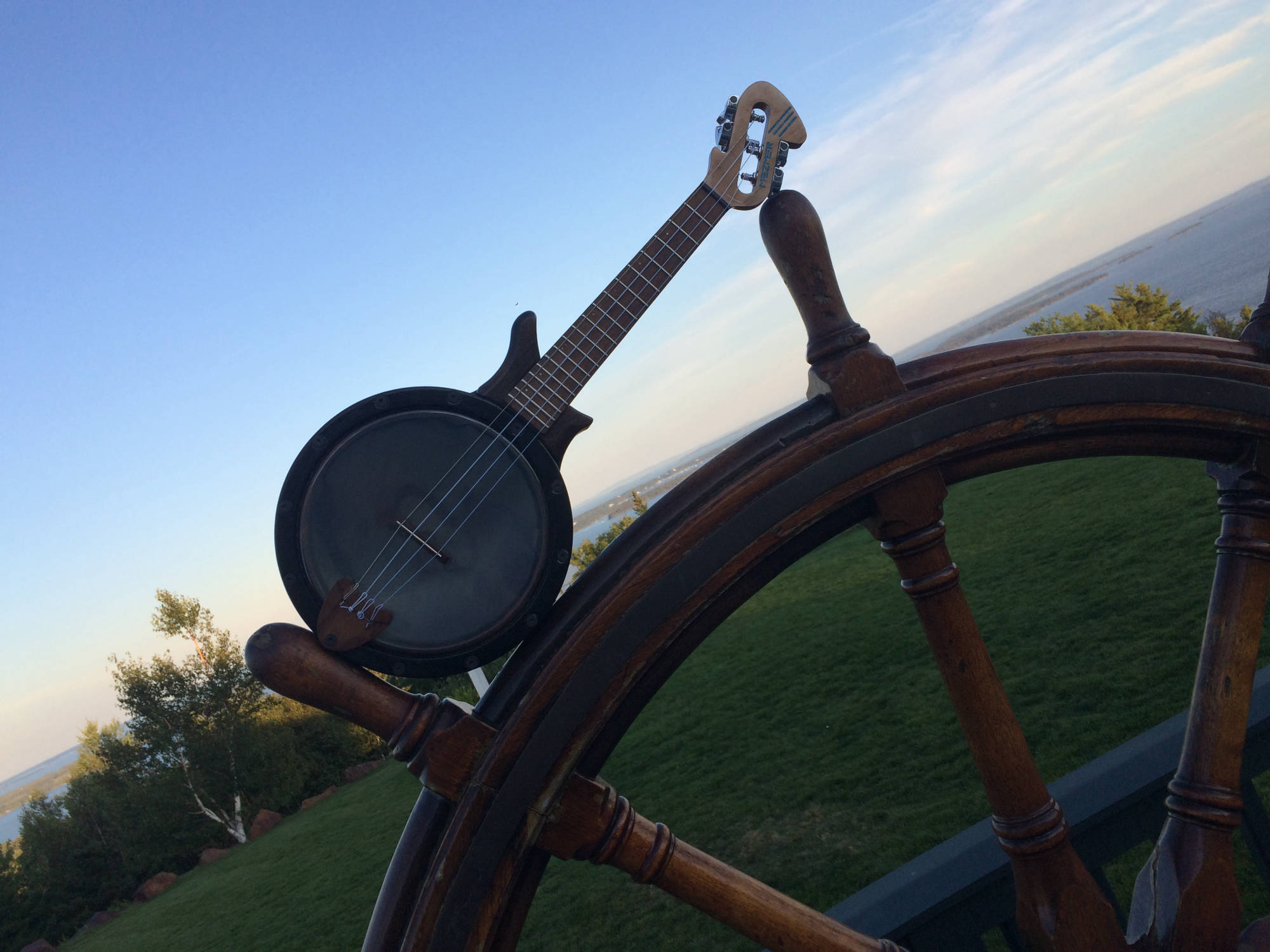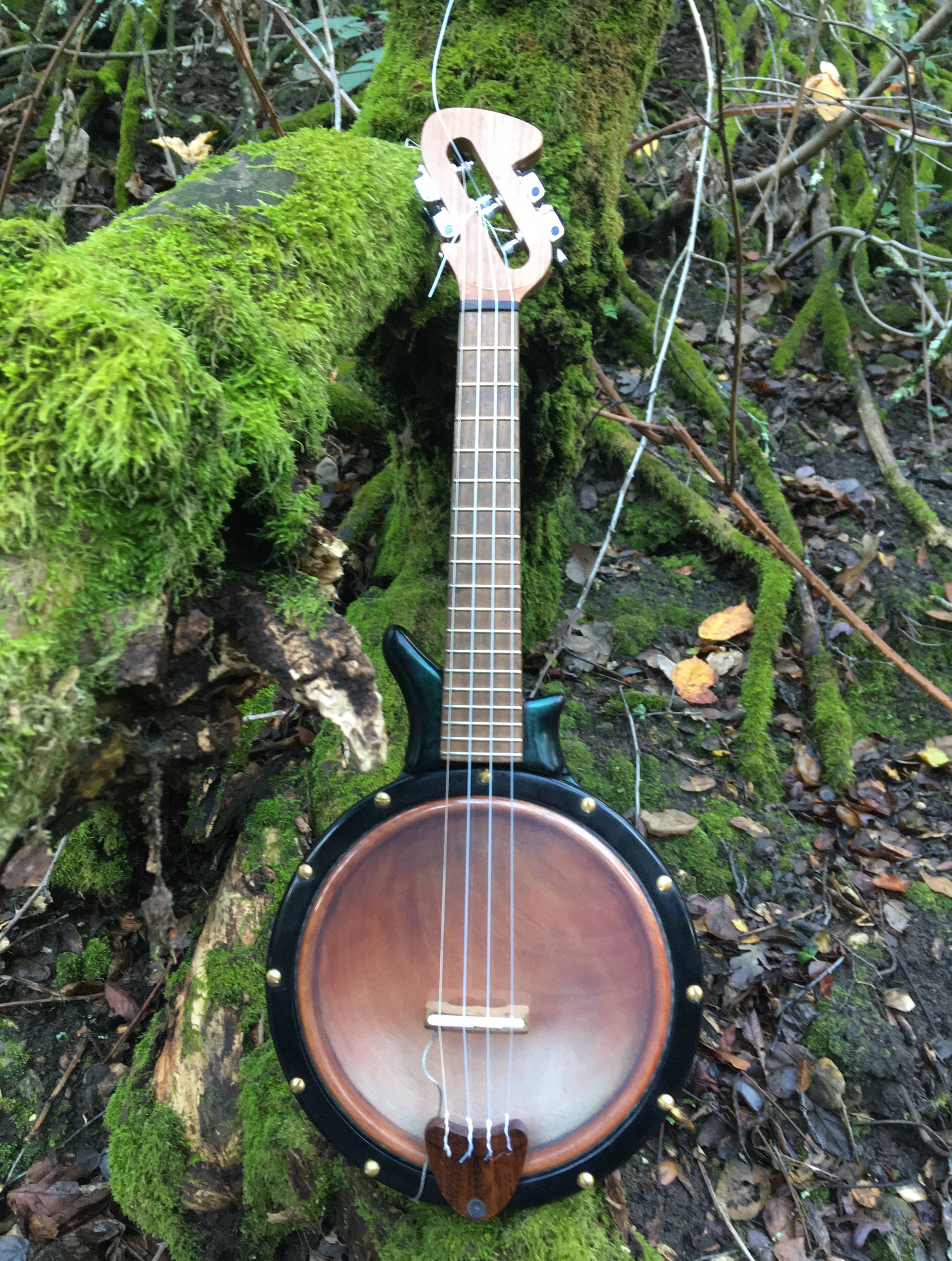 Built with a variety of hardwoods and reclaimed materials. Mezmer Banjoleles incorporate a sphere shaped back body which reflects the sound of the strings in a uniform and gradual way so that all frequencies are evenly represented in body resonance and and overemphasized notes or "wolf tones" are eliminated. The spherical design also mellows the sometimes strident attack of traditional Banjo design placing its tones closer to a Ukulele when strung with nylon strings. Steel strings can be used to move the tonal spectrum closer to that of a regular Banjo while still keeping the instrument from having too much of a face punching bark ;) .