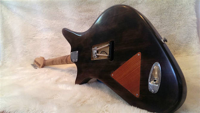 The unique and innovative contours of the Hyperion body were conceived with many features in mind. The upper horn provides perfect balance point for a strap in standing position as well as a comfortable support to lean into when in seated positions. The lower bout extends the control cavity for progressive electronic expansion as well as providing wood mass behind the bridge which helps to give the guitar a strong midrange voice and a particularly warm growl when pushing amplifier gain.